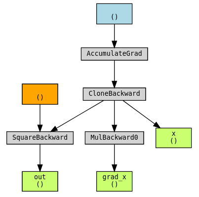 torchviz.make_dot((grad_x, x, out), params={"grad_x": grad_x, "x": x, "out": out})