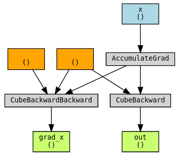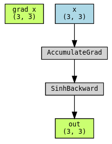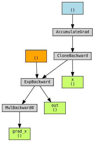 Now we show what happens when we don’t also return our intermediate results as outputs: grad_x would not even have a backward graph because it is purely a function exp and expnegx, which don’t require grad.