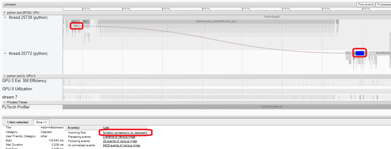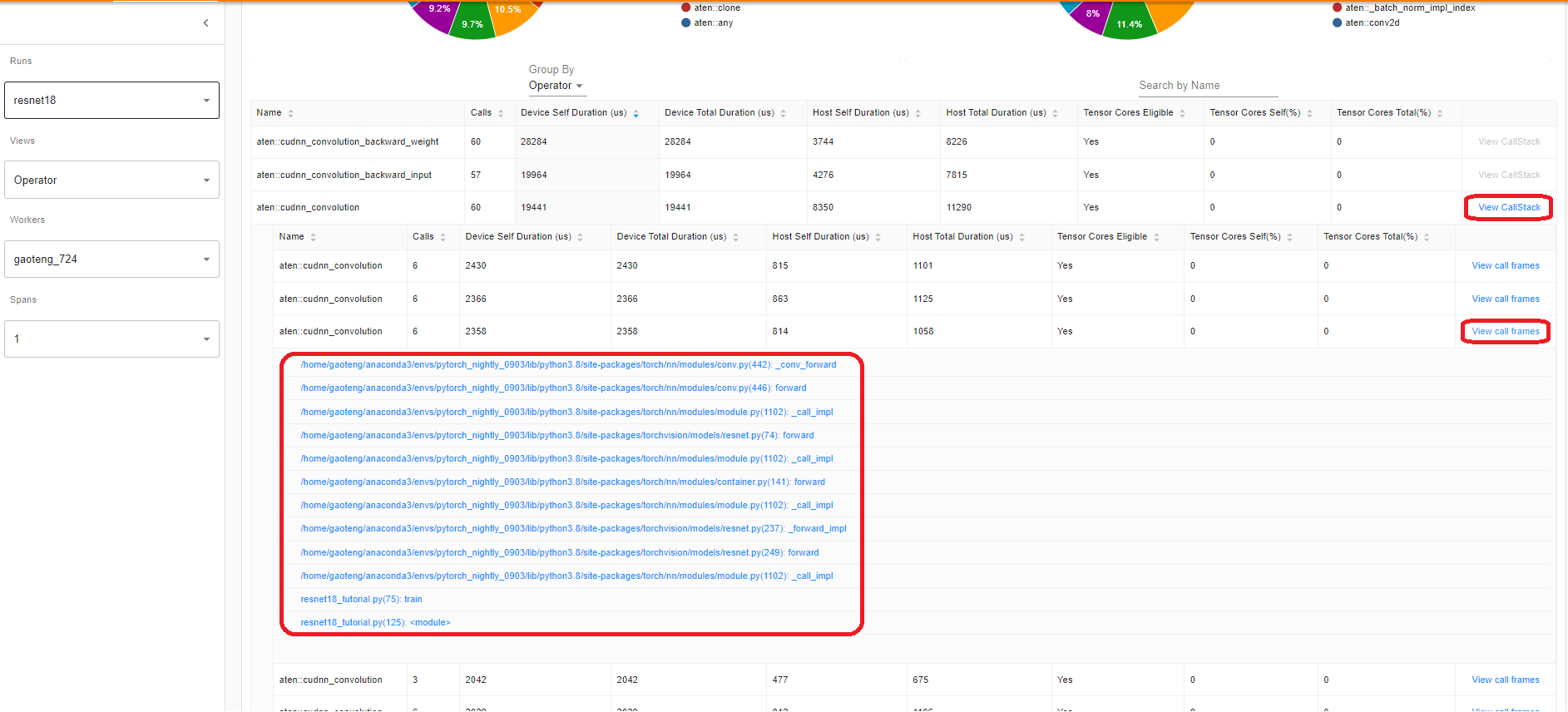 waitsteps, the profiler is disabled. Duringwarmupsteps, the profiler starts tracing but the results are discarded. This is for reducing the profiling overhead. The overhead at the beginning of profiling is high and easy to bring skew to the profiling result. Duringactivesteps, the profiler works and records events.on_trace_ready- callable that is called at the end of each cycle; In this example we usetorch.profiler.tensorboard_trace_handlerto generate result files for TensorBoard. After profiling, result files will be saved into the./log/resnet18directory. Specify this directory as alogdirparameter to analyze profile in TensorBoard.record_shapes- whether to record shapes of the operator inputs.profile_memory- Track tensor memory allocation/deallocation. Note, for old version of pytorch with version before 1.10, if you suffer long profiling time, please disable it or upgrade to new version.with_stack- Record source information (file and line number) for the ops. If the TensorBoard is launched in VS Code (reference), clicking a stack frame will navigate to the specific code line.