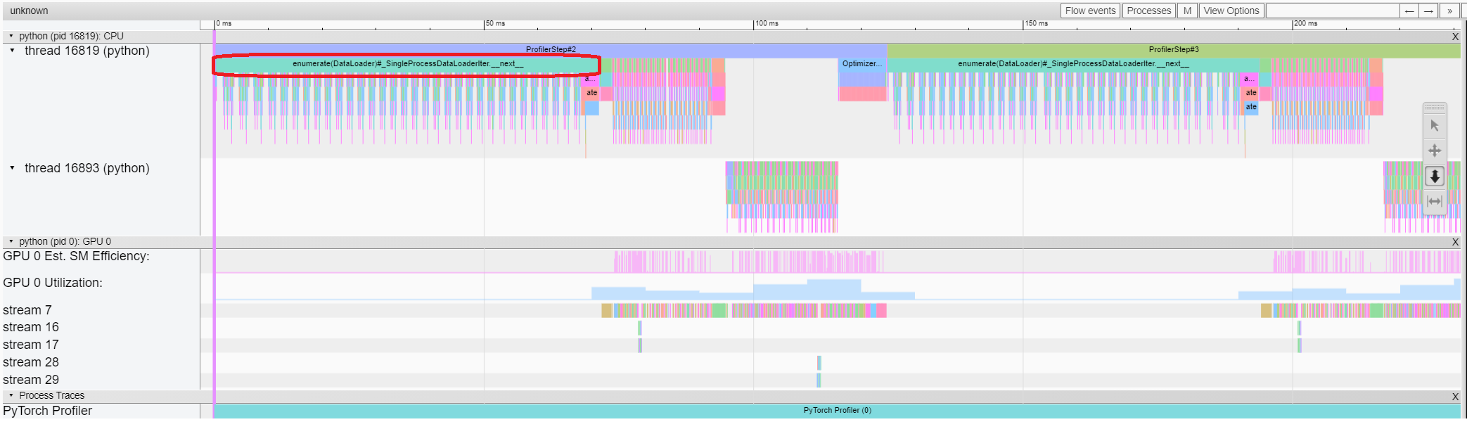 In this example, we can see the event prefixed with enumerate(DataLoader) costs a lot of time.