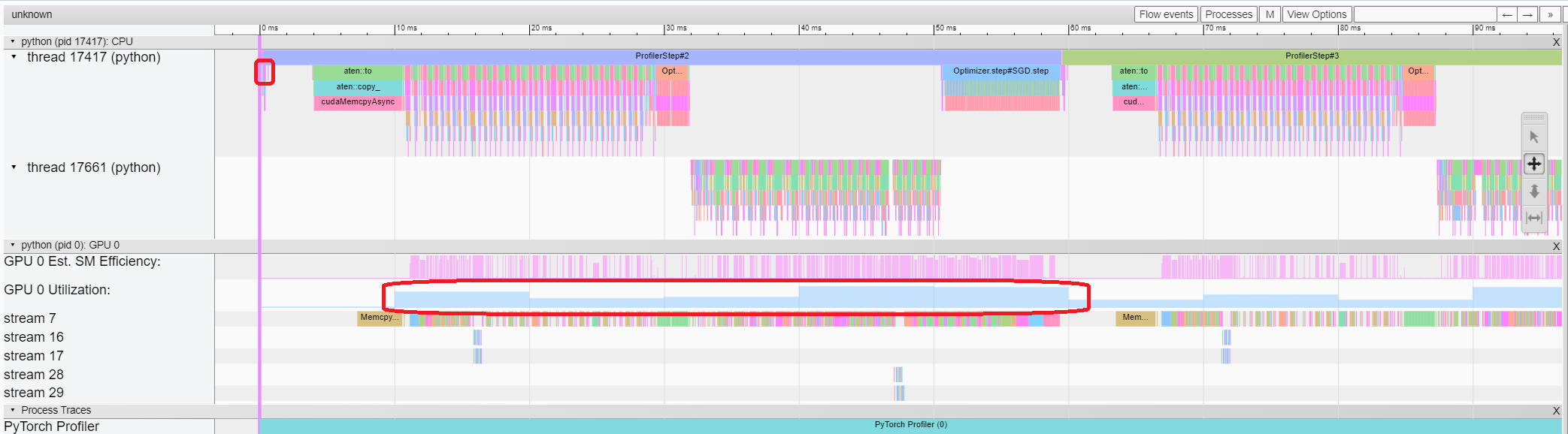 The memory curve shows the trends of memory consumption. The “Allocated” curve shows the total memory that is actually in use, e.g., tensors. In PyTorch, caching mechanism is employed in CUDA allocator and some other allocators. The “Reserved” curve shows the total memory that is reserved by the allocator. You can left click and drag on the graph to select events in the desired range: