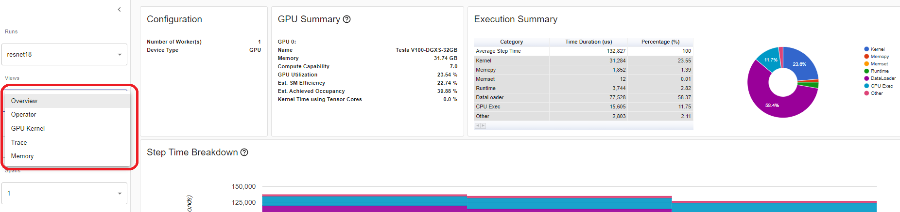 The “Step Time Breakdown” shows distribution of time spent in each step over different categories of execution.