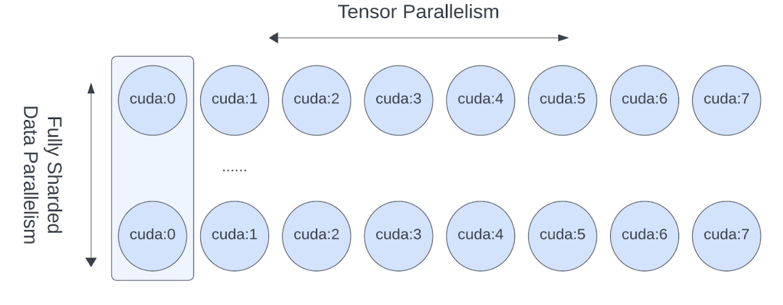 This would allow us to easily apply Tensor Parallel within each host (intra-host) and apply FSDP across hosts (inter-hosts), with 0-code changes to the Llama model. The Tensor(Model) Parallel and Data Parallel techniques combined together provides the ability to continue increasing model size and training efficiently using a large number of GPUs.