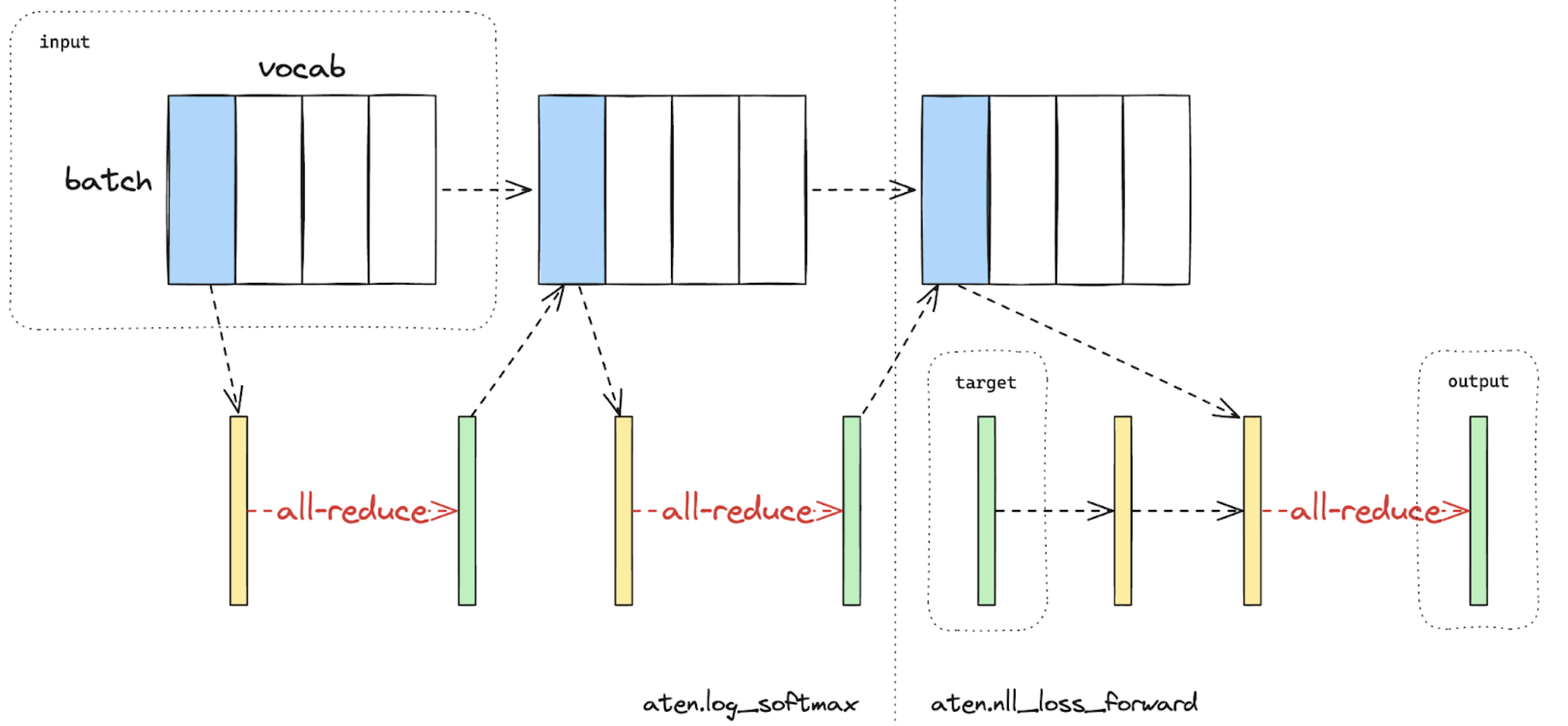Figure 2. Cross-entropy loss forward computation with loss parallel on one GPU. Blue represents sharded tensors; green represents replicated tensors; yellow represents tensors with partial values (to be all-reduced). Black arrows are local computations; red arrows are functional collectives among GPUs.¶