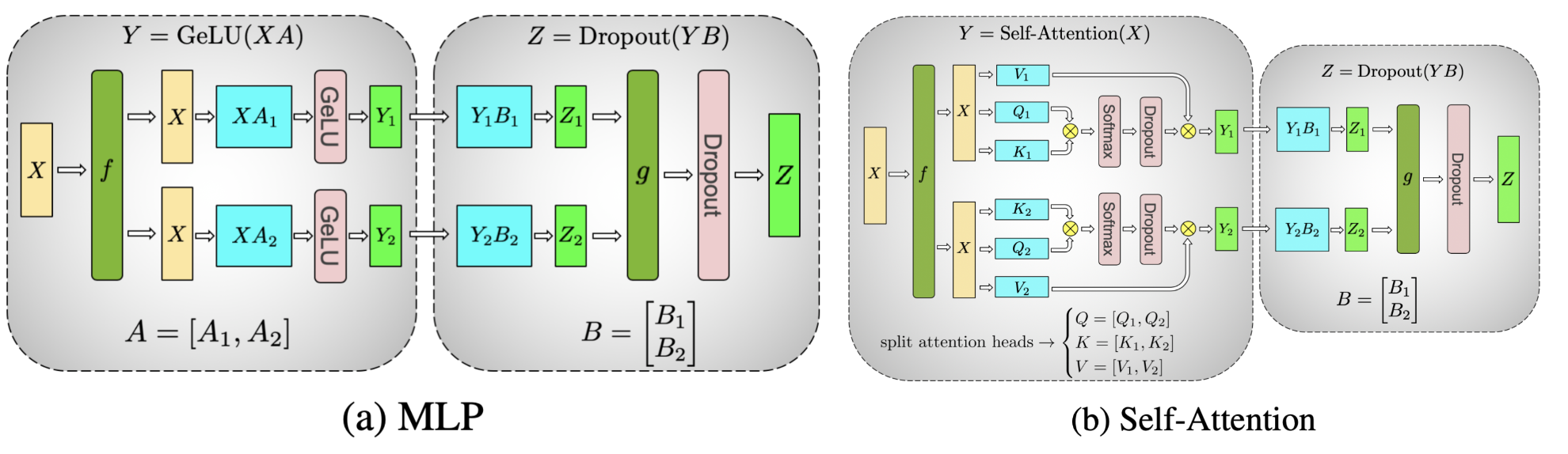 Figure 1. represents the sharding in Tensor Parallel style on a Transformer model’s MLP and Self-Attention layer, where the matrix multiplications in both attention/MLP happens through sharded computations (image source)¶